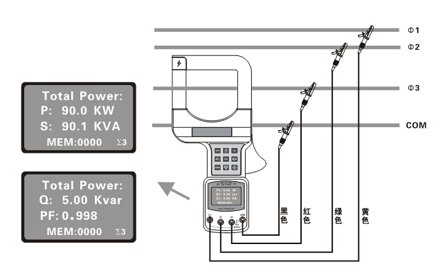 三相交流電壓、電流、有功功率、無(wú)功功率、視在功率、總功率、電流與電壓的相位、相電壓之間的相位、頻率、電能、相序等 |